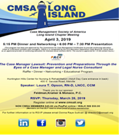 Next Chapter Meeting: Wednesday, April 3, 2019 Topic: The Case Manager Lawsuit: Prevention and Preparations Through the Eyes of a Case Manager and Legal Nurse Consultant Speaker: Laura T. Opson, RN-D, LNCC, CCM Click HERE to register! Thank you to our Sponsor Feldman, Kramer & Monaco, P.C. |